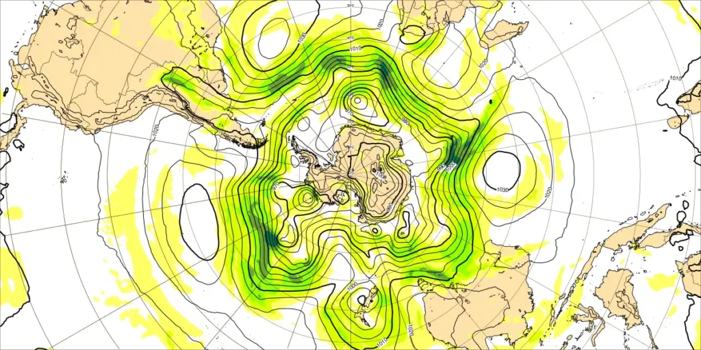 ・偏西風の蛇行は、小~大、特にバレンツ海のリッジの流れで蛇行大