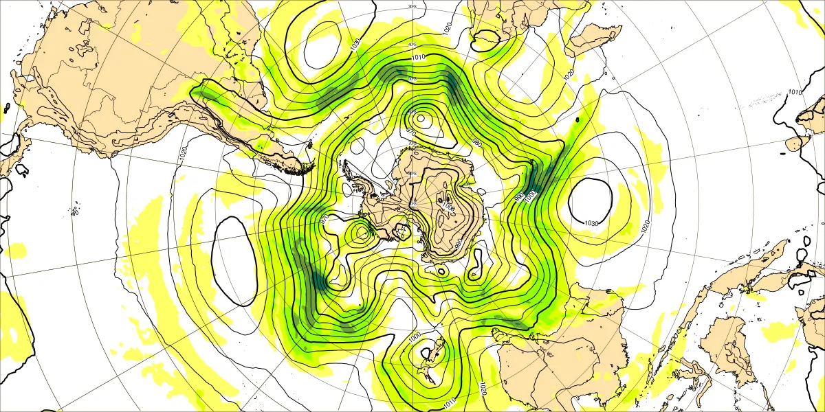 ・ニュージーランドの寒冷渦:寒気北上、850hPa・4℃線が30S近くまで
