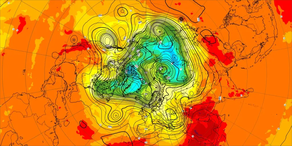 ・太平洋160Eの寒冷渦:寒気南下、850hPa・0℃線が40Nまで