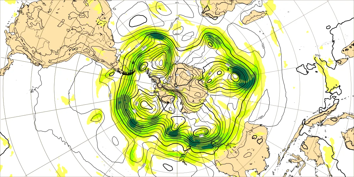 ・偏西風の蛇行は、小~大、特に南極大陸100Eのリッジの流れで蛇行大