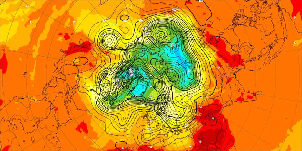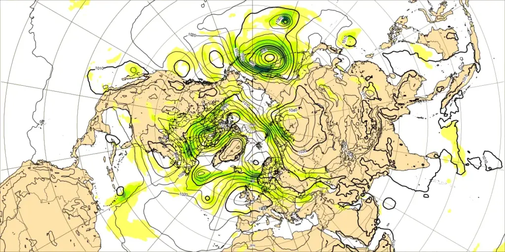 ・イギリスの高気圧:暖気北上、850hPa・12℃線が60N近くまで