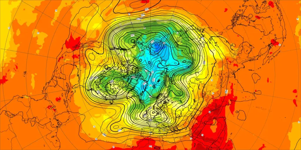 ・カナダ100Wのリッジ:暖気北上、850hPa・4℃線が70N近くまで