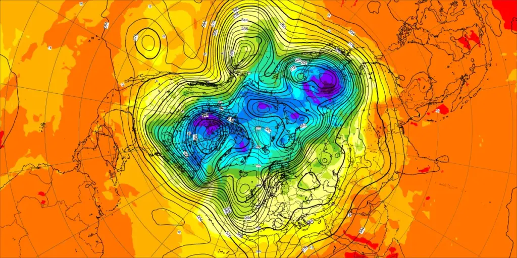 ・イギリスのNWの寒冷渦:寒気東進、850hPa・0℃線は45Nの少しS