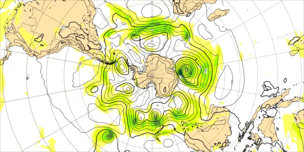 ・太平洋120Wの寒気トラフ:寒気北上:850hPa・4℃線が30Sまで