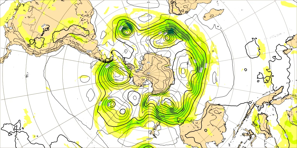 ・オーストラリアSE部で暖気南下:850hPa・16℃線が35Sまで