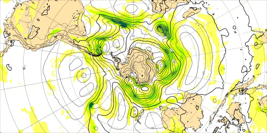 ・ニュージーランドの寒冷渦:寒気北上、850hPa・8℃線が30S以北まで