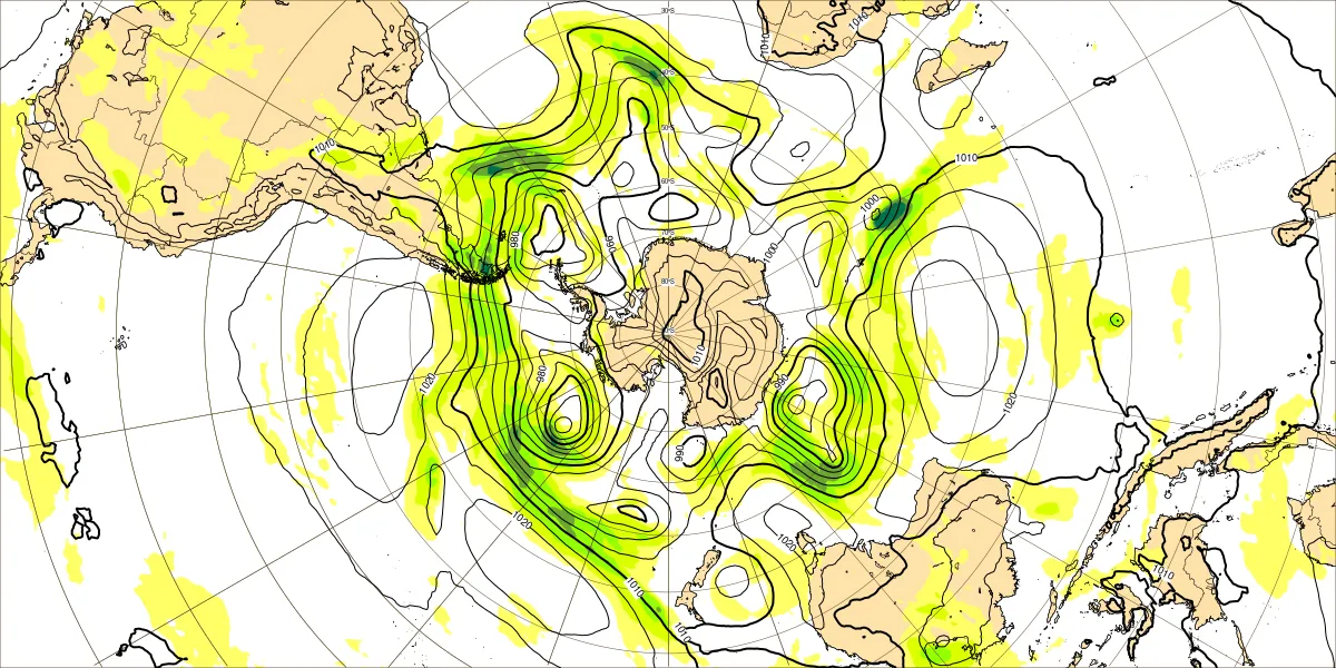 ・インド洋45Eの寒気トラフ:寒気東進、850hPa・4℃線は40S