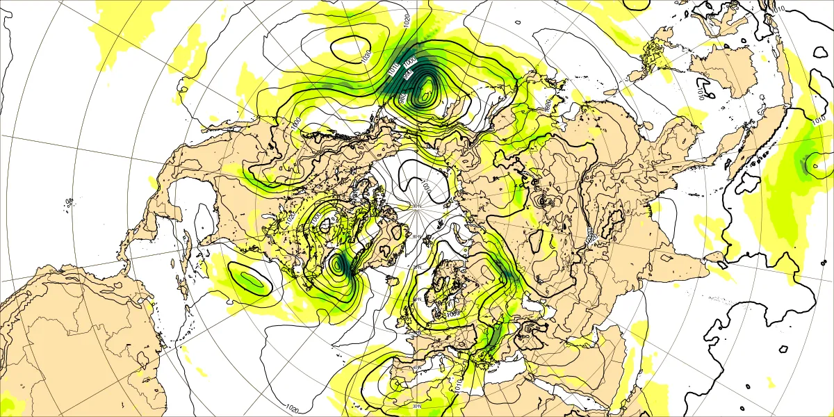 ・グリーンランドのリッジ:暖気北上、850hPa・0℃線が75N近くまで