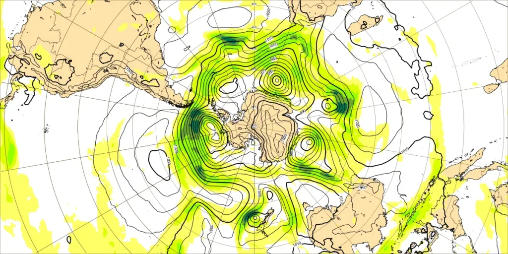 ・偏西風の蛇行は、小~大、特にボーフォート海のリッジの流れで蛇行大