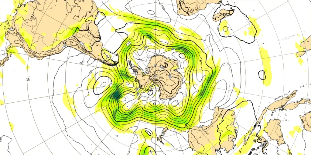 ・チリS部の寒気トラフ:寒気北上、850hPa・0℃線が45S以北まで