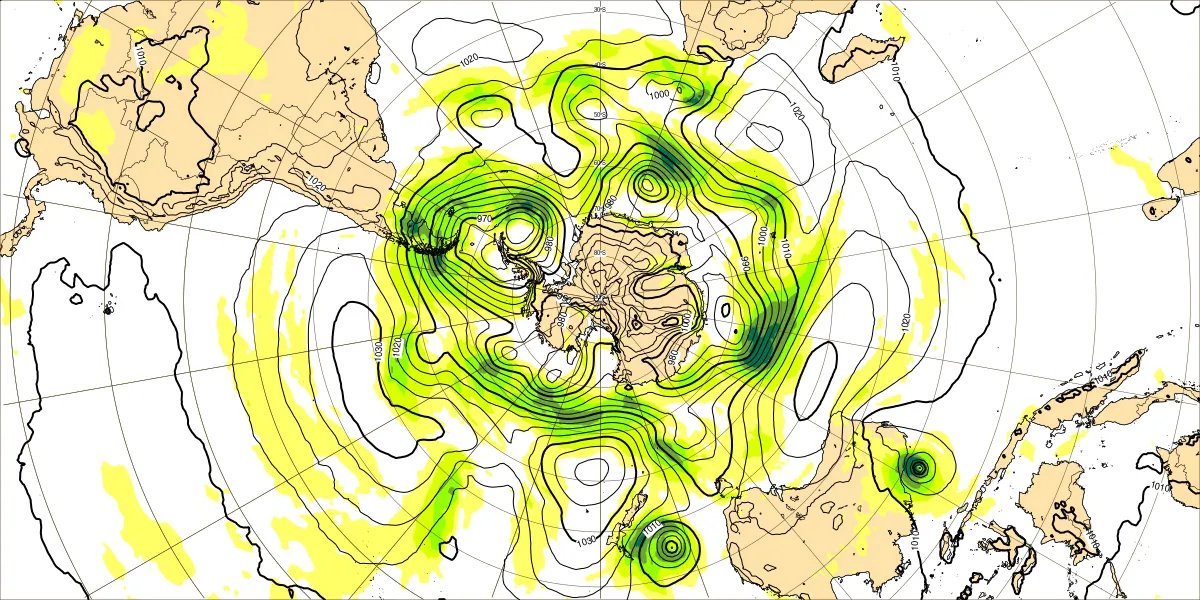 ・オーストラリアのS(135E)の寒気トラフ:寒気北上、850hPa・0℃線が40S以北まで