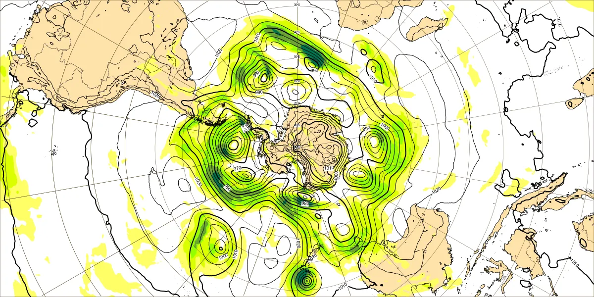 ・太平洋90Wの寒気トラフ:寒気北上、850hPa・0℃線が40S以北まで