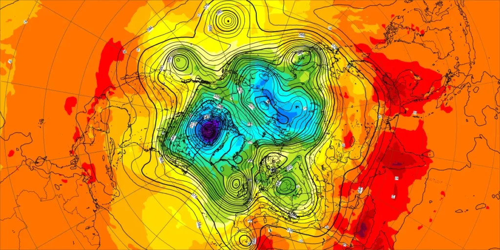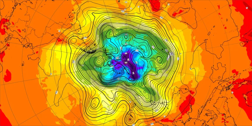・イギリスのWの寒冷渦:寒気南下、850hPa・4℃線が35Nまで