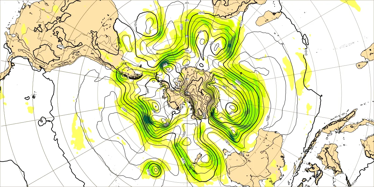 ・ニュージーランドのWの寒冷渦:寒気北上、850hPa・8℃線が30S近くまで