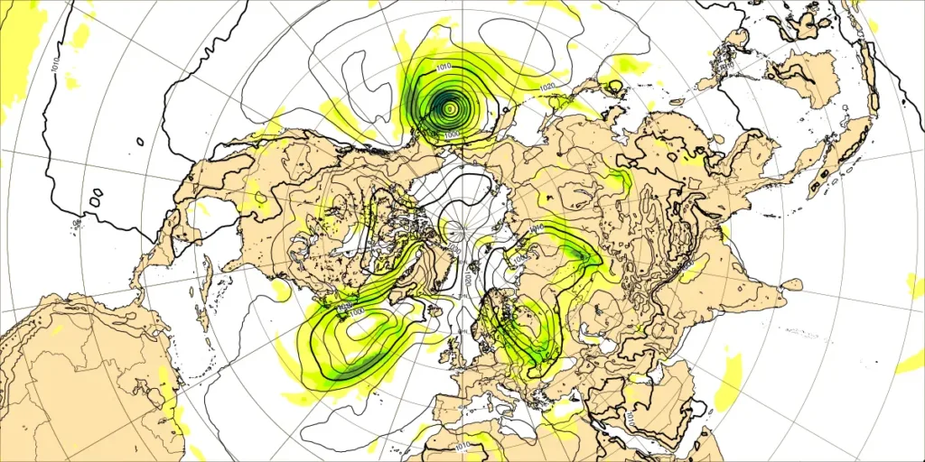 ・シベリア95Eのリッジ:暖気北上、850hPa・12℃線が60N近くまで