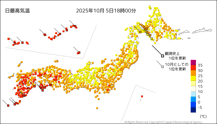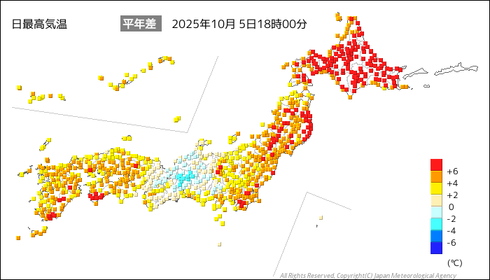 国内気温概況:2025年10月5日18時(日本時間)までの最高気温の平年差