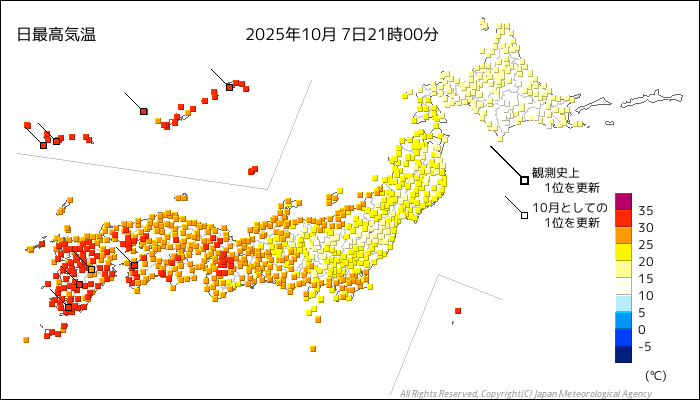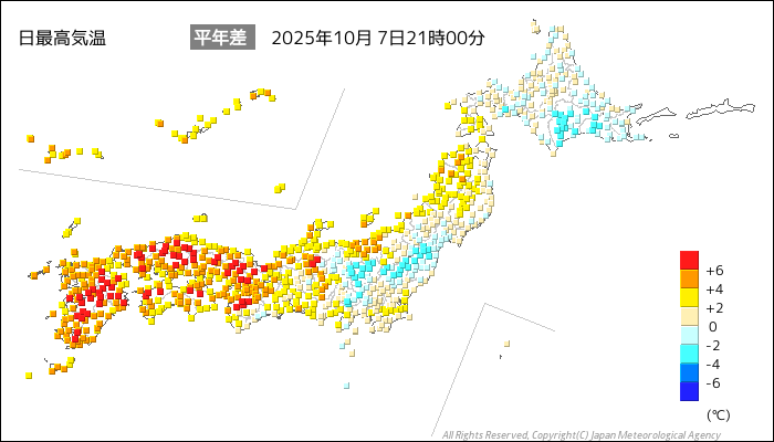 国内気温概況:2025年10月7日21時(日本時間)までの最高気温の平年差