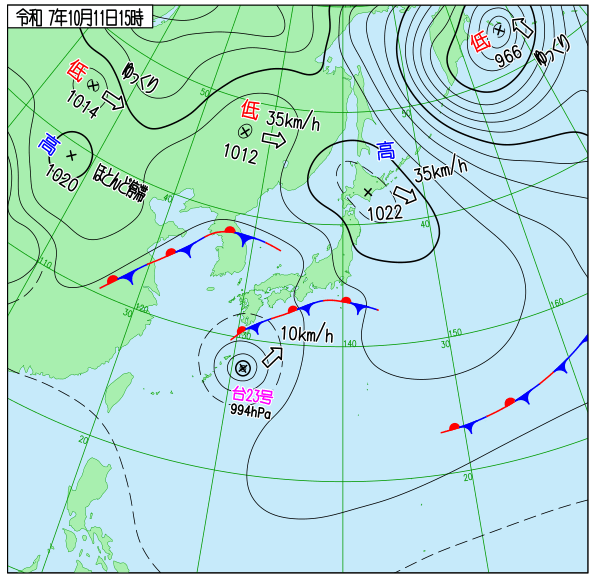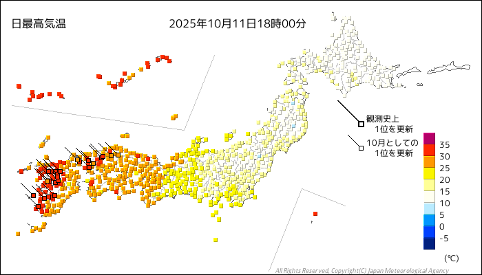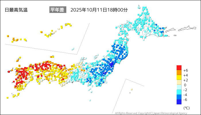 2025/10/11 | 18時までの最高気温平年差(小数点以下切り捨て) | |