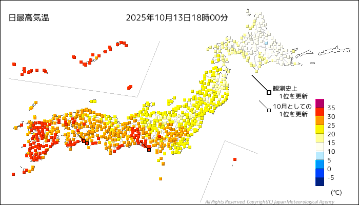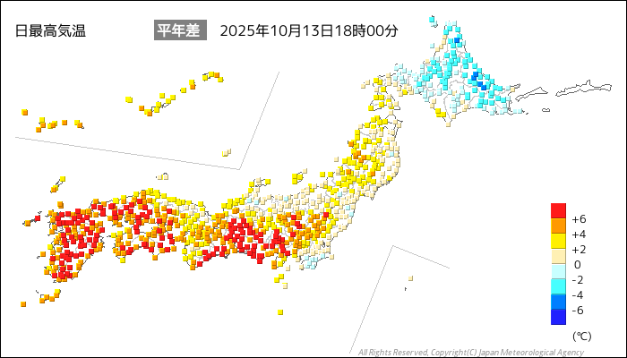 2025/10/13 | 18時までの最高気温平年差(小数点以下切り捨て) | |