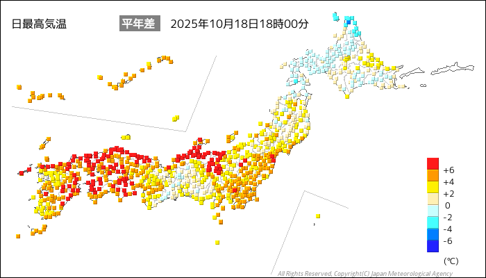 国内気温概況:2025年10月18日18時(日本時間)までの最高気温の平年差