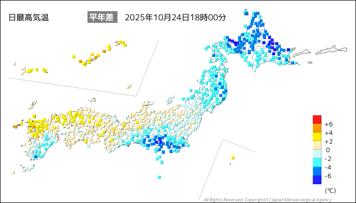 国内気温概況:2025年10月24日18時(日本時間)までの最高気温の平年差