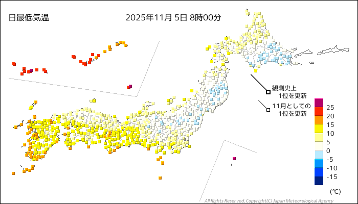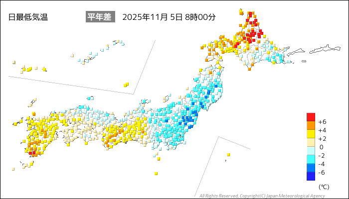 国内気温概況:2025年11月5日8時(日本時間)までの最低気温の平年差
