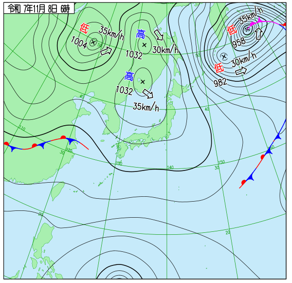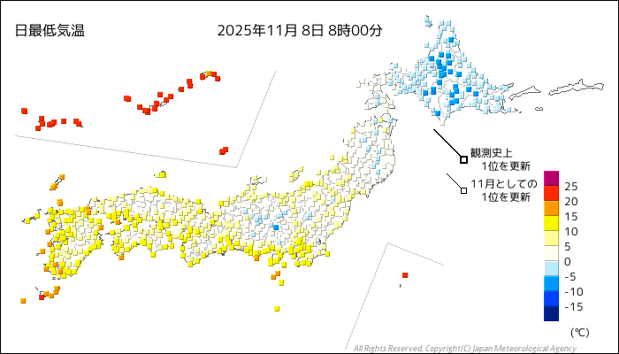 | 2025/11/8 | 8時までの最低気温平年差(小数点以下切り捨て) | |