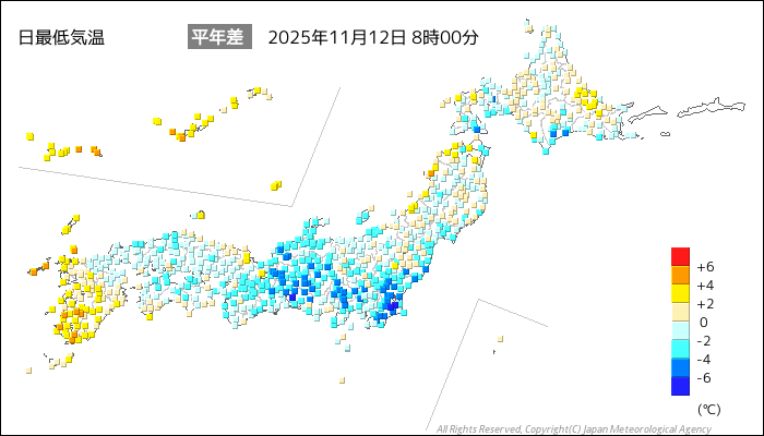 国内気温概況:2025年11月12日8時(日本時間)までの最低気温の平年差