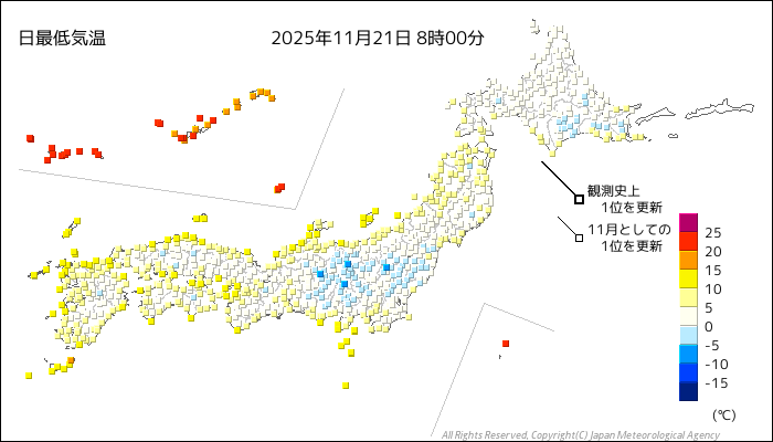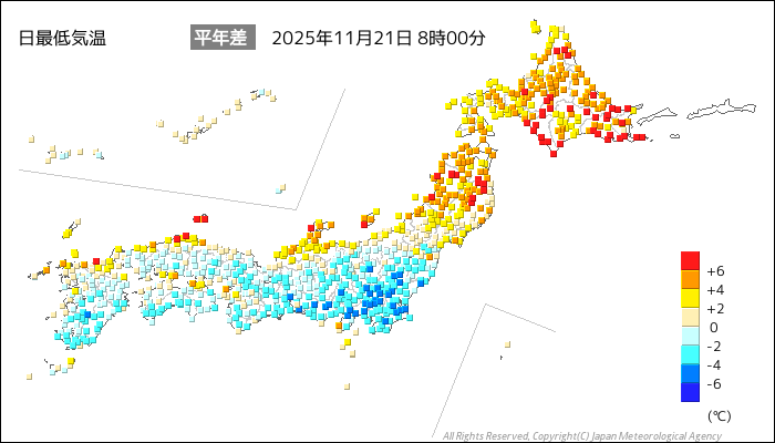 国内気温概況:2025年11月21日8時(日本時間)までの最低気温の平年差