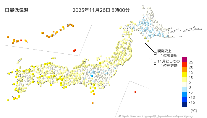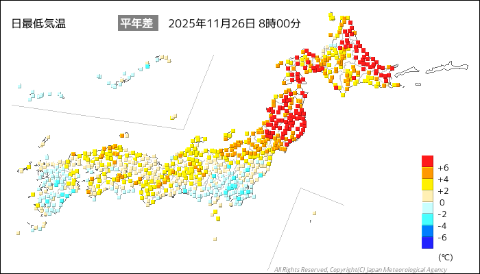 国内気温概況:2025年11月26日8時(日本時間)までの最低気温の平年差