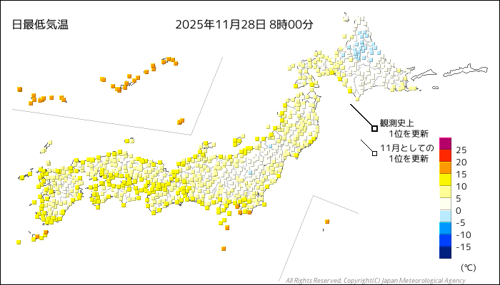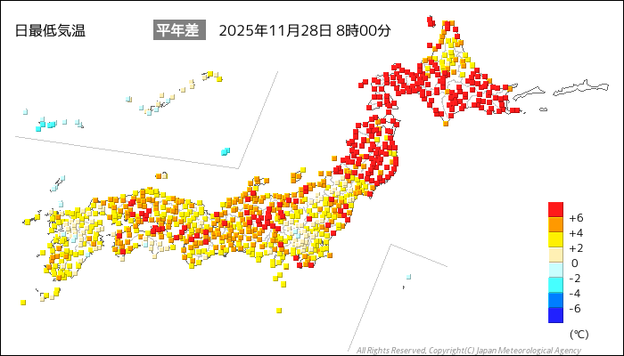 国内気温概況:2025年11月28日8時(日本時間)までの最低気温の平年差