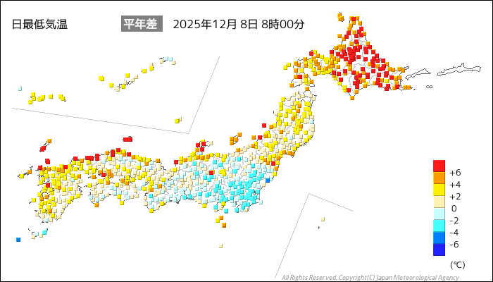 国内気温概況:2025年12月8日8時(日本時間)までの最低気温の平年差