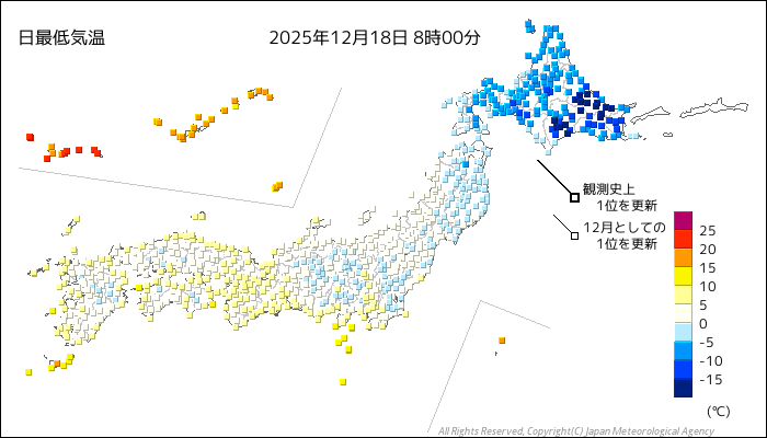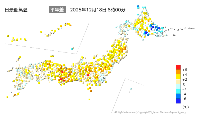 国内気温概況:2025年12月18日8時(日本時間)までの最低気温の平年差