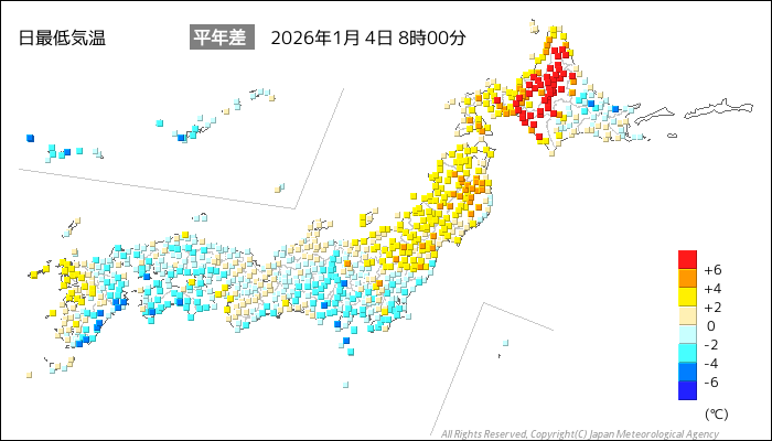 国内気温概況:2026年1月4日8時(日本時間)までの最低気温の平年差