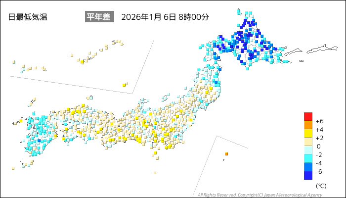 国内気温概況:2026年1月6日8時(日本時間)までの最低気温の平年差
