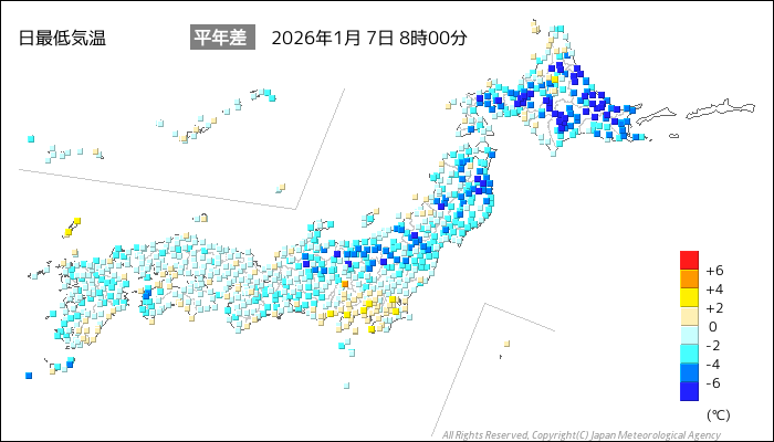 国内気温概況:2026年1月7日8時(日本時間)までの最低気温の平年差