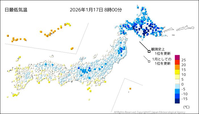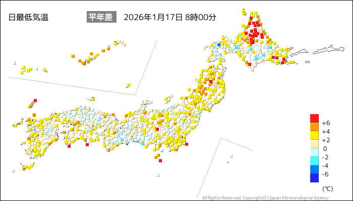 国内気温概況:2026年1月17日8時(日本時間)までの最低気温の平年差