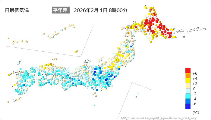 国内気温概況:2026年2月1日8時(日本時間)までの最低気温の平年差