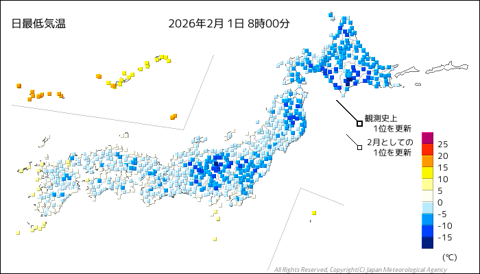※ 2月1日(日本時間24時まで)の国内気温記録更新:なし
