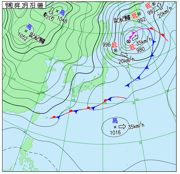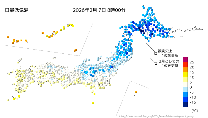 | 2026/2/7 | 8時までの最低気温平年差(小数点以下切り捨て) | |