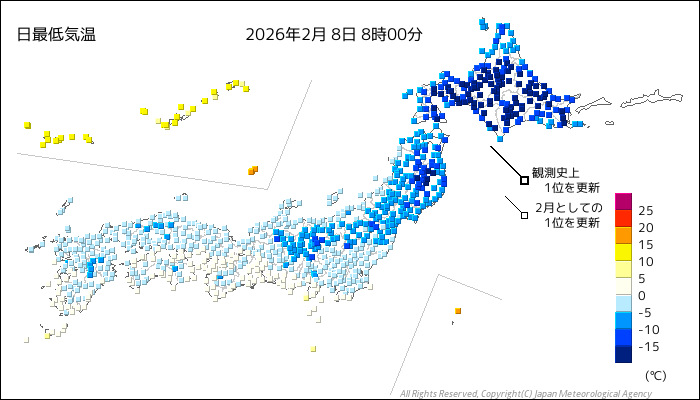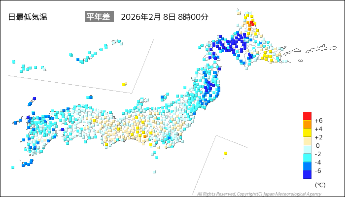 | 2026/2/8 | 8時までの最低気温平年差(小数点以下切り捨て) | |