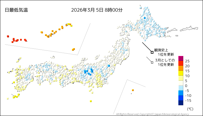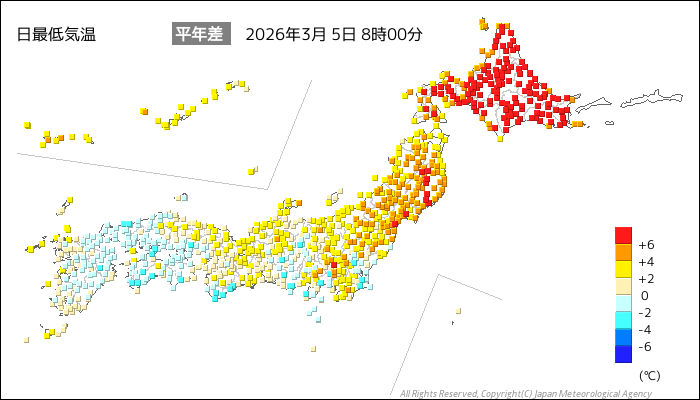 国内気温概況:2026年3月5日8時(日本時間)までの最低気温の平年差