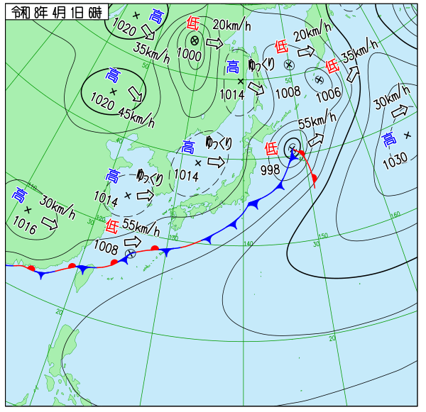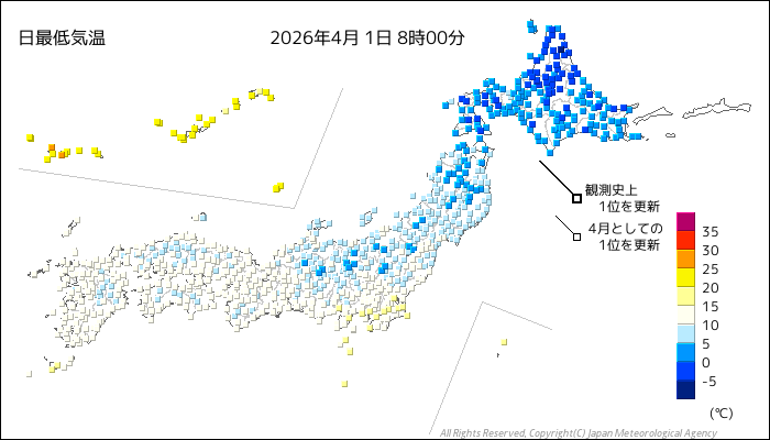 | 2026/4/1 | 8時までの最低気温平年差(小数点以下切り捨て) | |