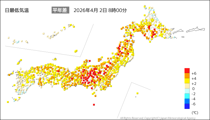 国内気温概況:2026年4月2日8時(日本時間)までの最低気温の平年差