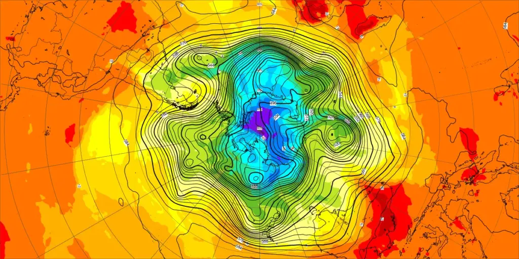 ・イギリスのWの寒冷渦:寒気東進、850hPa・0℃線は50N