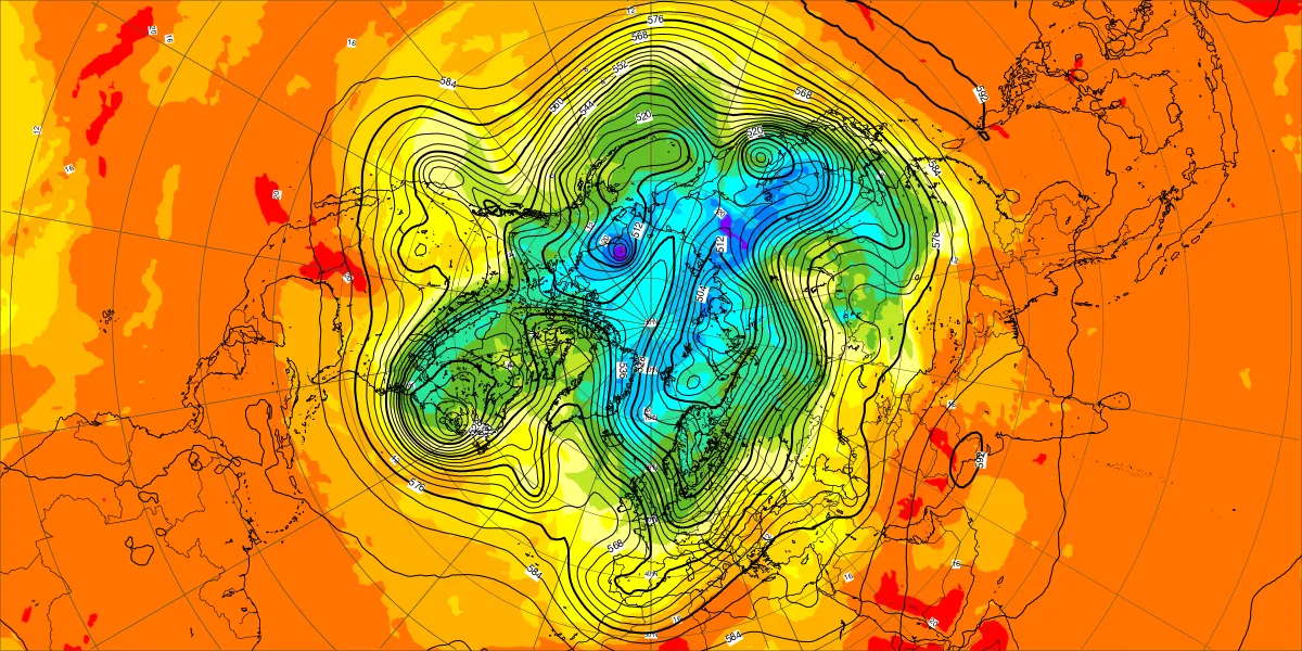 ・カナダ65Wの寒冷渦:寒気南下、850hPa・-8℃線が40Nまで