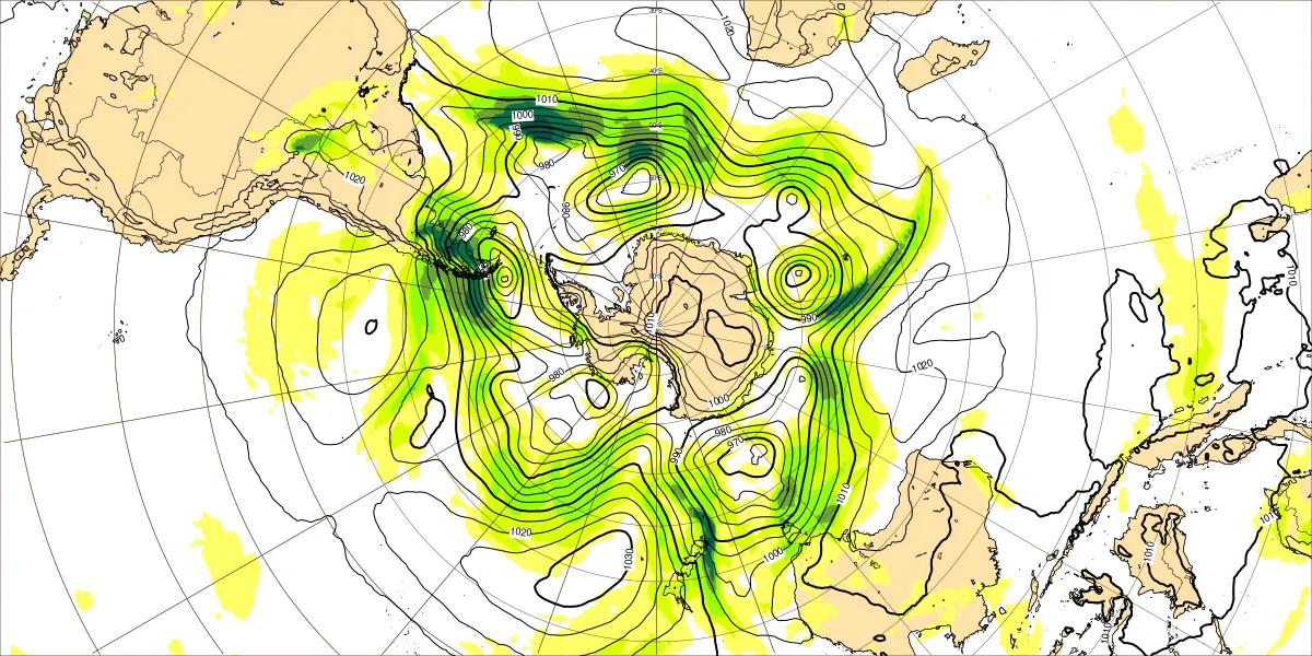 ・ニュージーランドのEのリッジ:暖気南下、850hPa・8℃線が55Sまで