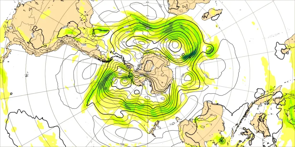 ・偏西風の蛇行は、やや大~大、特に南極半島付近のリッジの流れで蛇行大
