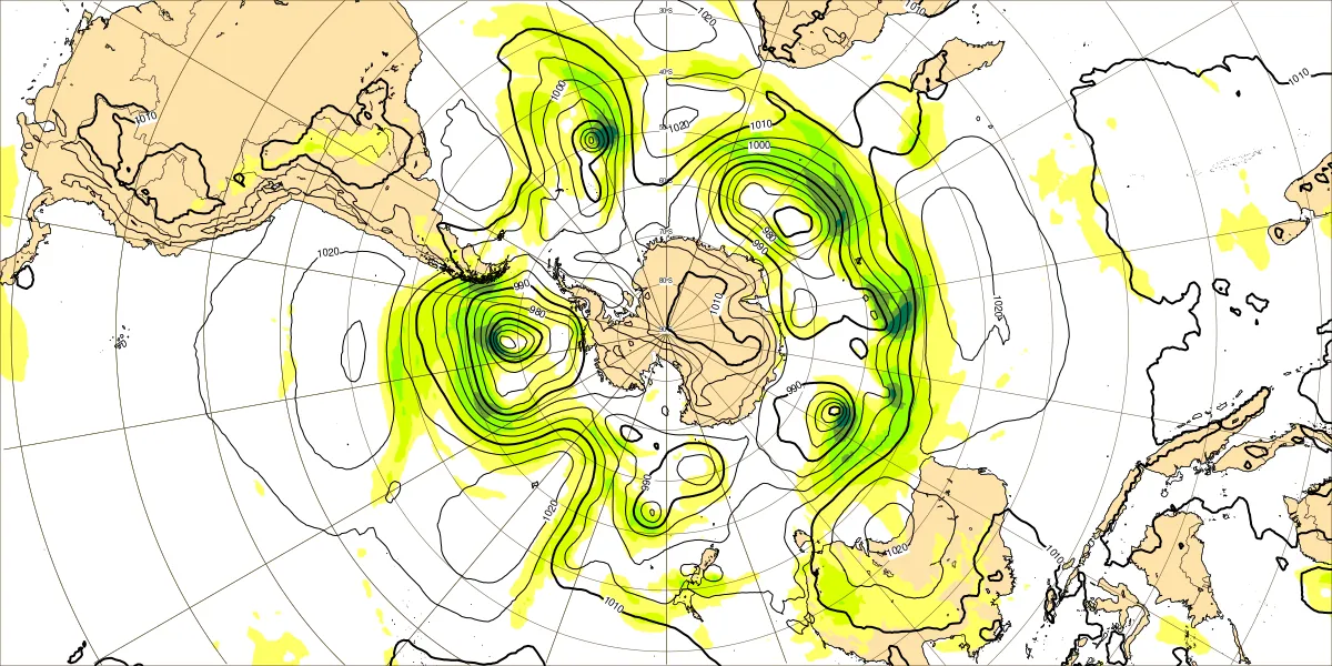 ・太平洋130Wの寒気トラフ:寒気北上、850hPa・0℃線が40S近くまで