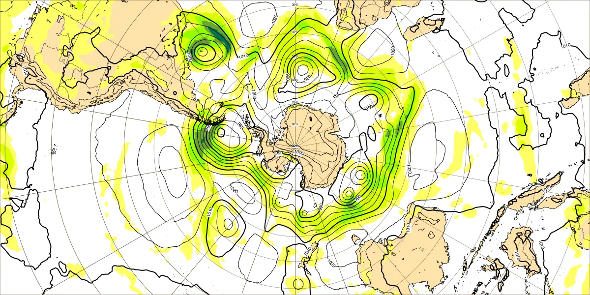 ・ニュージーランドの寒気トラフ:寒気東進、850hPa・4℃線は40Sの少しN